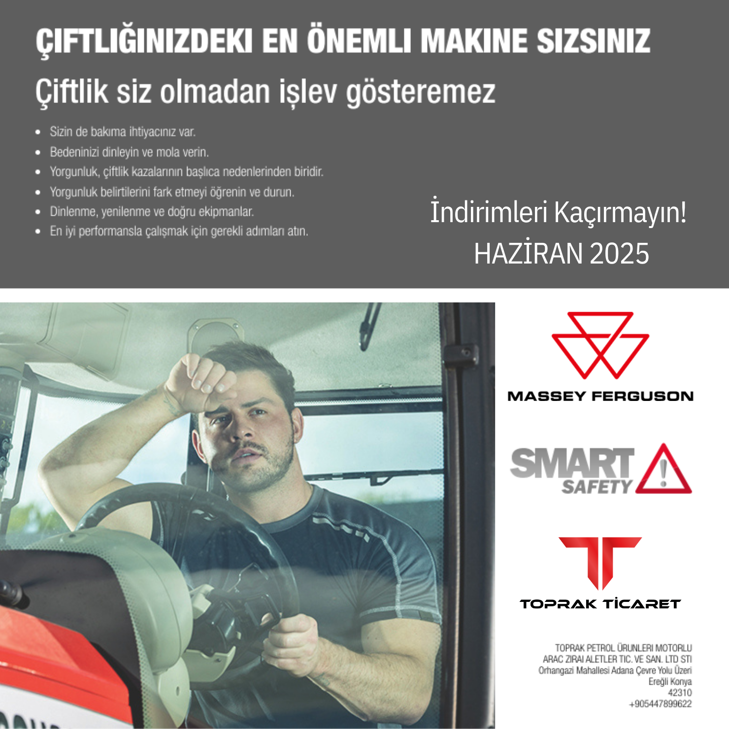 Yorgunluk, çiftlik kazalarının başlıca nedenlerinden biridir. Belirtileri fark edin, mola verin ve doğru ekipmanla çalışın.